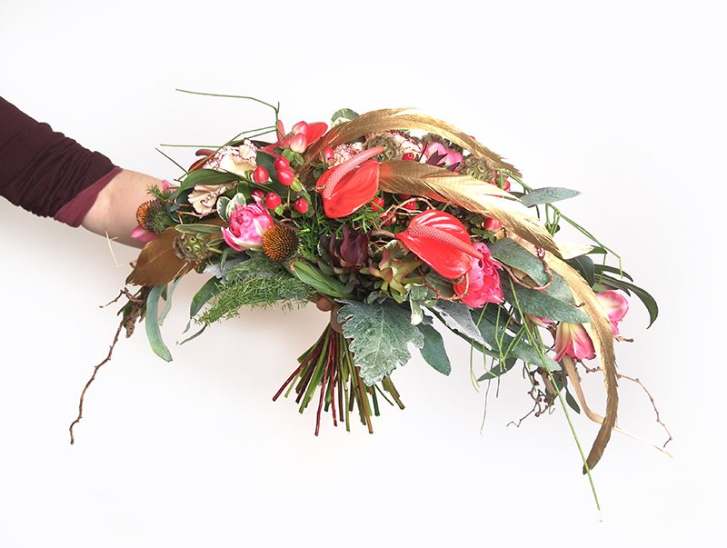 Bukiet ten jest jednym z czterech, które zostały zaprezentowane podczas warsztatów online zorganizowanych przez VHV Flowers and Greens – firmę dostarczającą kwiaty bezpośrednio do kwiaciarni. Warsztaty poprowadził Maciej Krzus. Wszystkie jego walentynkowe pomysły były bardzo interesujące, zarówno pod kątem florystycznym jak i sprzedażowym. Efektowne, niebanalne, z ciekawego materiału roślinnego i szybkie w przygotowaniu. Zapraszamy was do wykonania jednej z tych prac. Jest to bukiet w kształcie łuku wykonany na konstrukcji z drutu palonego.