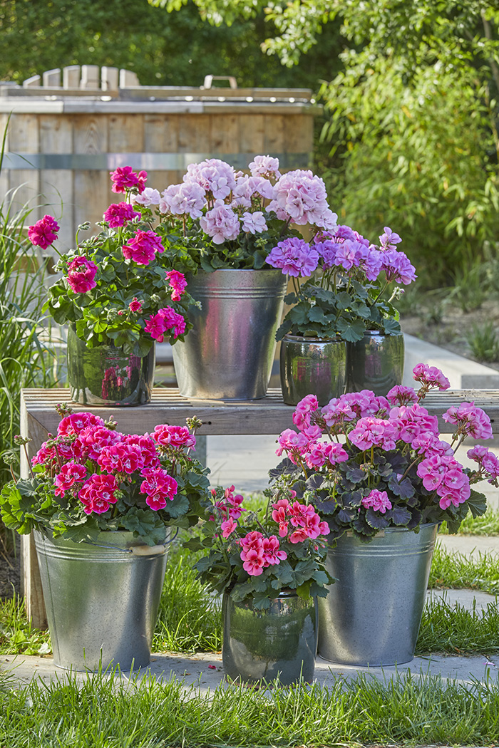 Kolejną pomocną wskazówką jest łączenie różnych odmian tej samej rośliny o kontrastujących wysokościach, kształtach, fakturach, liściach itp. Pelargonie są dostępne w wielu pięknych kolorach, kształtach i rozmiarach, dlatego łatwo można stworzyć efektowną ekspozycję z tych samych uwielbianych, wieloletnich roślin.