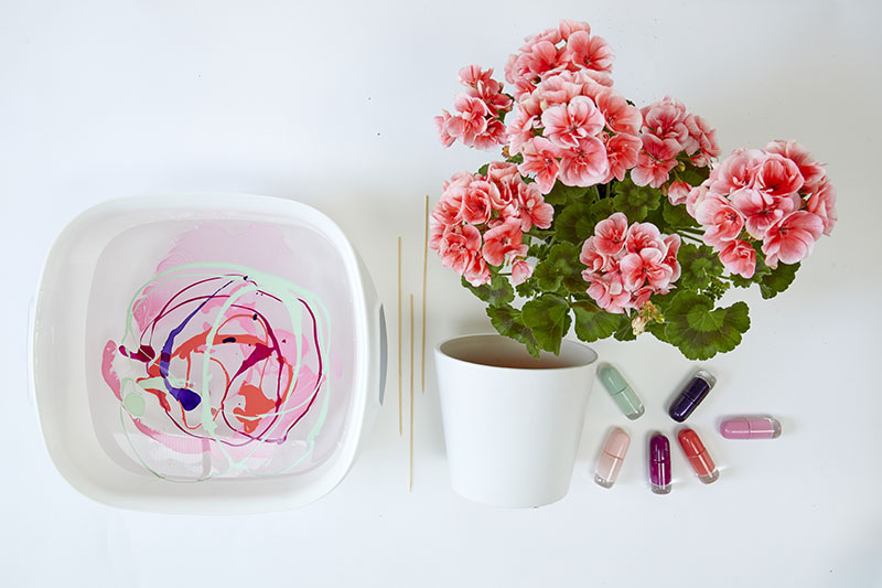 Prawdziwe perełki na miejskie balkony! Lakiery do paznokci zamieniają zwykłe, białe doniczki w wyjątkowe przedmioty dekoracyjne, które można wykorzystać do wyeksponowania pelargonii i innych roślin balkonowych. Pomysł DIY, który jest równie prosty, jak szybki. Wystarczą białe doniczki, lakiery do paznokci w różnych kolorach, drewniane patyczki do mieszania i duża miska lub naczynie z wodą. Instrukcja: Wlej lakiery do paznokci w różnych kolorach do miski z wodą. Dokładnie je wymieszaj drewnianym patyczkiem, aż powstanie ładny wzór. W miarę szybko zanurz i otocz doniczkę w lakierach, aż cała powierzchnia zostanie ozdobiona. Następnie odstaw ją do wyschnięcia. Twoje wyjątkowe dzieło jest gotowe!
