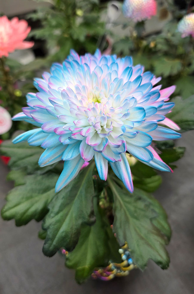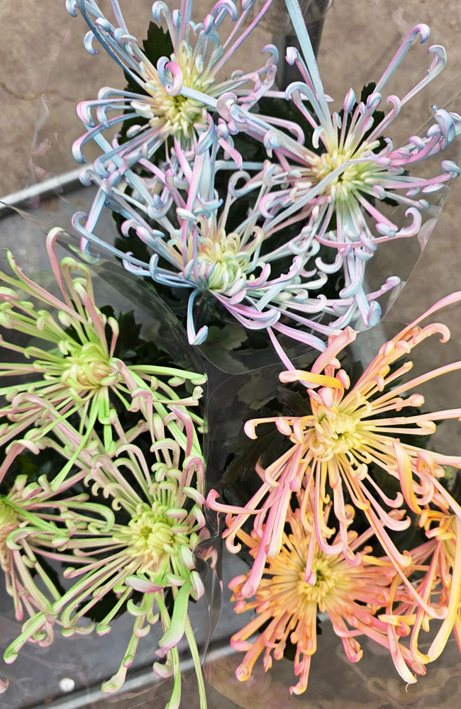 Miniaturowe i kompaktowe odmiany znów stały się popularne – tym razem nie tylko na tarasach. Chryzantemy doniczkowe coraz częściej zdobią wnętrza domów, stoliki kawowe i parapety. W mediach społecznościowych coraz częściej widać stylizacje z chryzantemami ustawionymi na stołach, komodach czy parapetach – w donicach z ceramiki, gliny lub betonu. To pokazuje, że chryzantemy doniczkowe zyskały zupełnie nowe życie. Producenci wciąż poszukują nowych pomysłów na zainteresowanie, na przykład oferując chryzantemy doniczkowe w wersji farbowanej – jak te z grupy Decorum (Lion Plants), na zdjęciach poniżej: