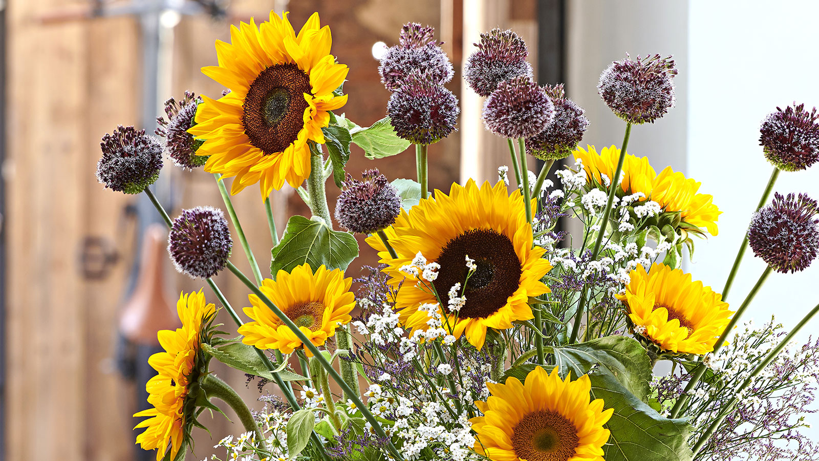 Słoneczniki można z powodzeniem wkomponować w różne aranżacje kwiatowe. Tworząc letnie bukiety, warto łączyć je z innymi sezonowymi kwiatami, takimi jak mieczyki, celozje, gerbery czy gloriozy.