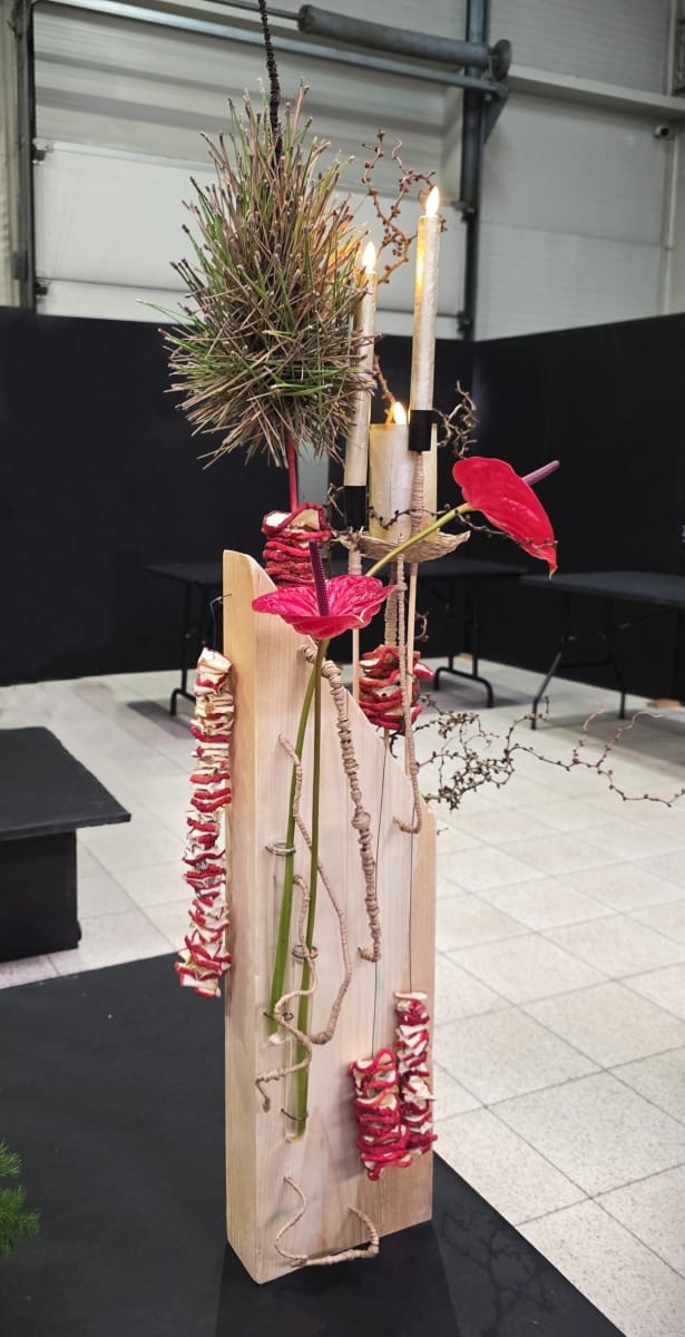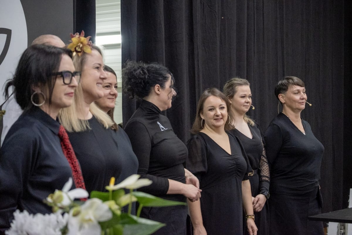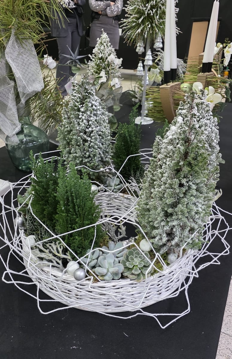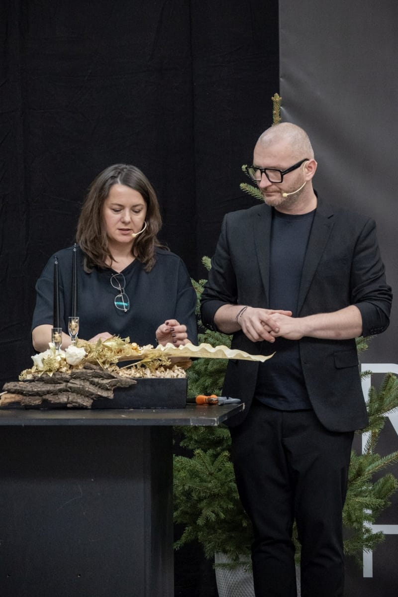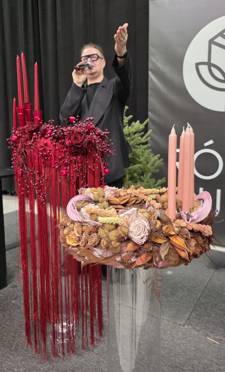 Pokaz miał bardzo użytkowy charakter. Każda kompozycja była omawiana krok po kroku tak, by uczestnicy mogli później odtworzyć ją w swojej kwiaciarni: jakie materiały wybierać, jak łączyć tekstury, jak budować świąteczną harmonię bez przesady, ale i bez nudy. Dobrze było widać, że uczennice chciały pokazać nie tylko efekt, ale też tok myślenia.