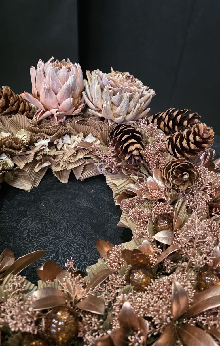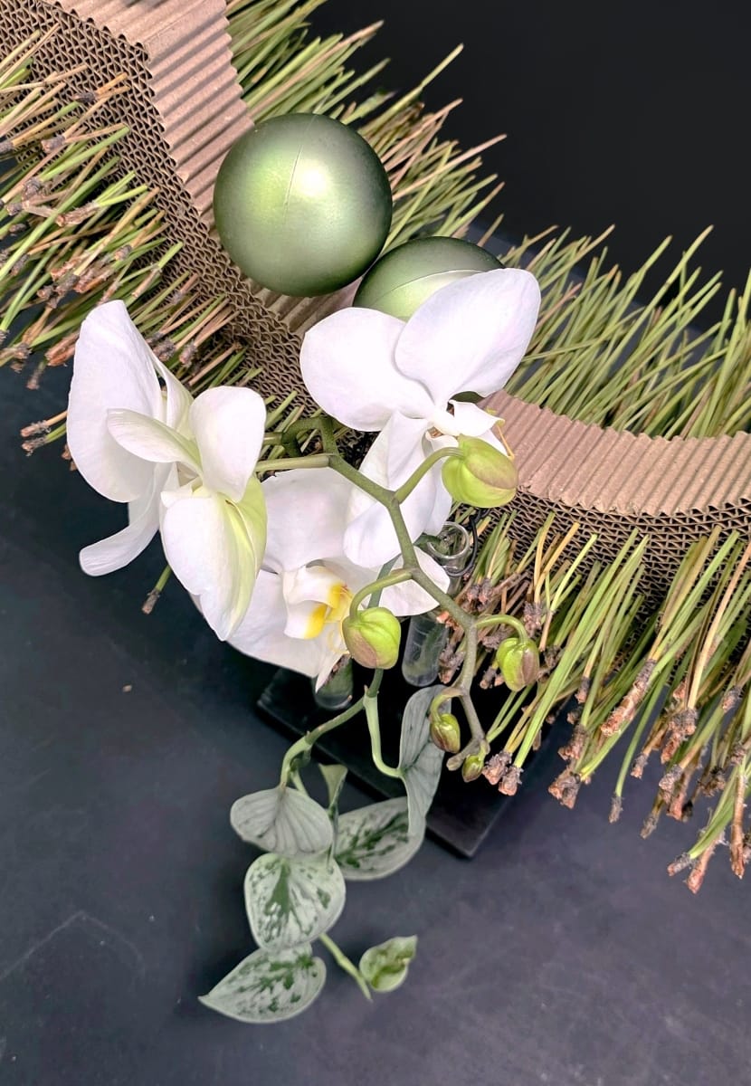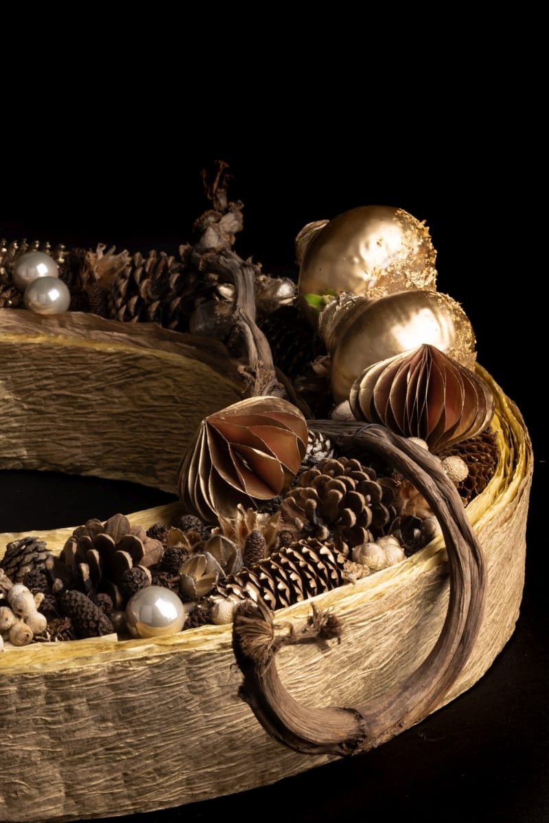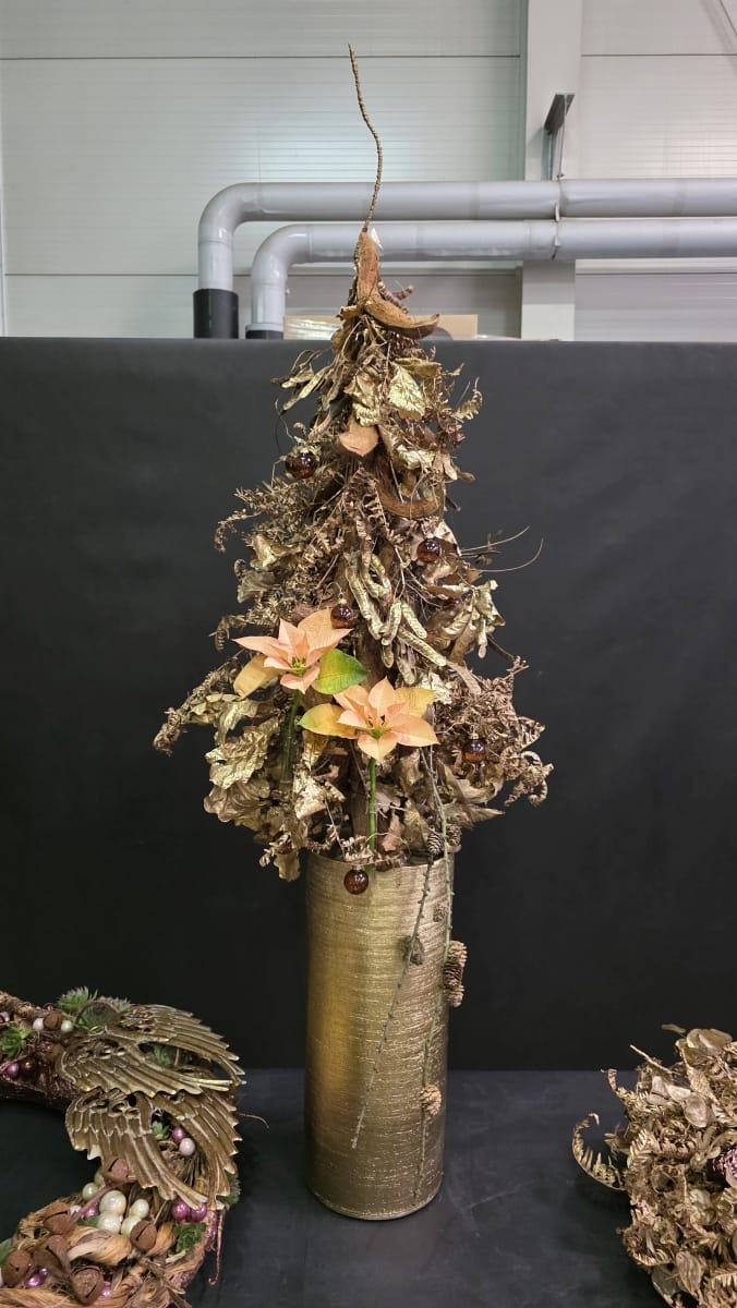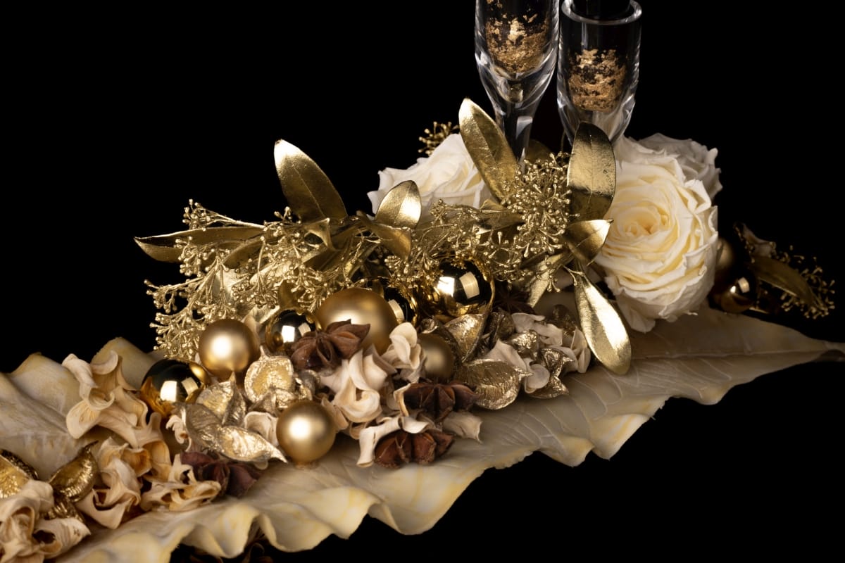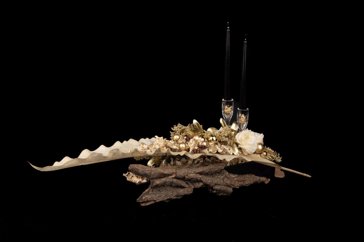 Najbardziej zaskakująca okazała się pierwsza kolekcja: biała, chłodna, minimalistyczna. Mocno nowoczesna, świadomie nie „dla każdego klienta”. Użyto w niej nietypowych materiałów, m.in. aluminiowych ścinków z obróbki metalu czy… tekturowego drapaka dla kota. To połączenia, które w tradycyjnej florystyce pojawiają się rzadko. Kolejne kolekcje utrzymały się już w bardziej klasycznym świątecznym kanonie: czerwienie, srebro, złoto i naturalne odcienie brązu.