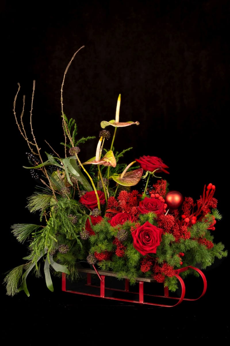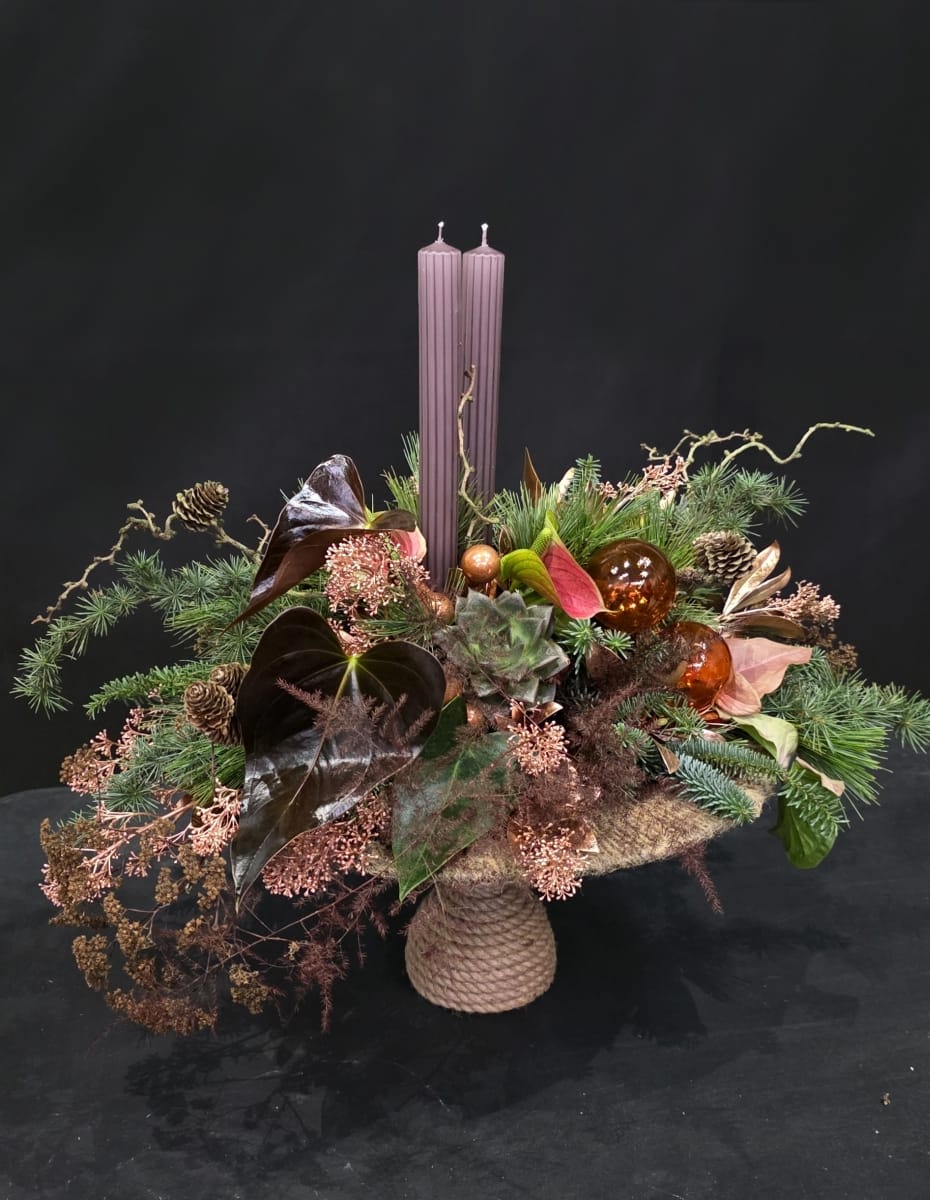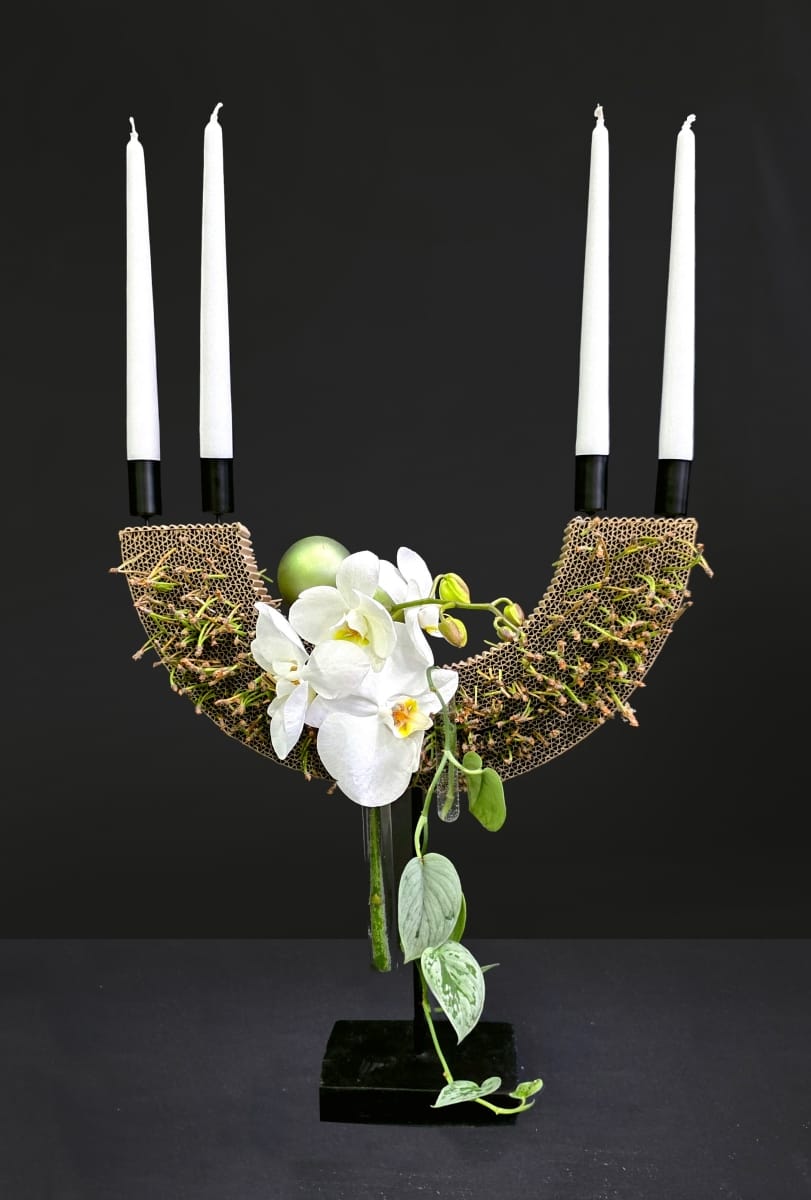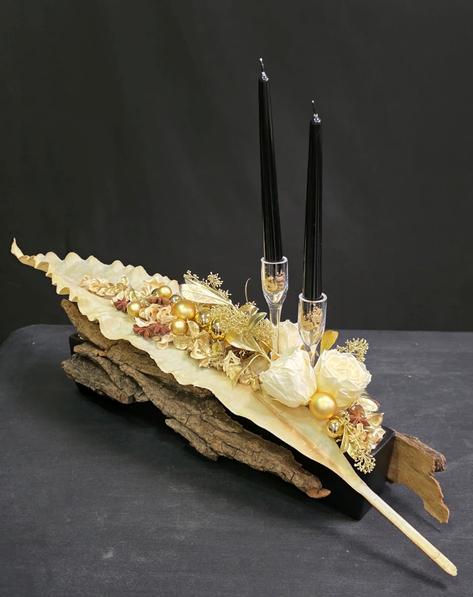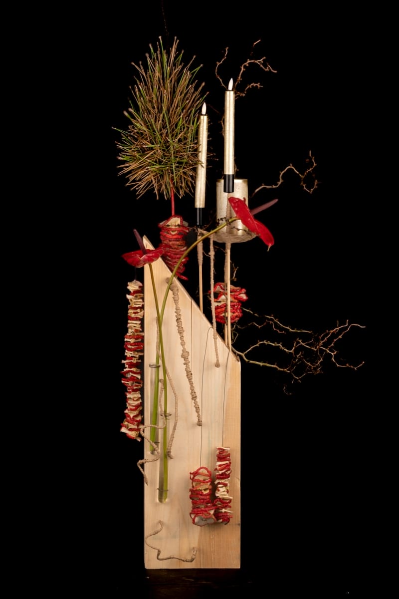 Najbardziej zaskakująca okazała się pierwsza kolekcja: biała, chłodna, minimalistyczna. Mocno nowoczesna, świadomie nie „dla każdego klienta”. Użyto w niej nietypowych materiałów, m.in. aluminiowych ścinków z obróbki metalu czy… tekturowego drapaka dla kota. To połączenia, które w tradycyjnej florystyce pojawiają się rzadko. Kolejne kolekcje utrzymały się już w bardziej klasycznym świątecznym kanonie: czerwienie, srebro, złoto i naturalne odcienie brązu.