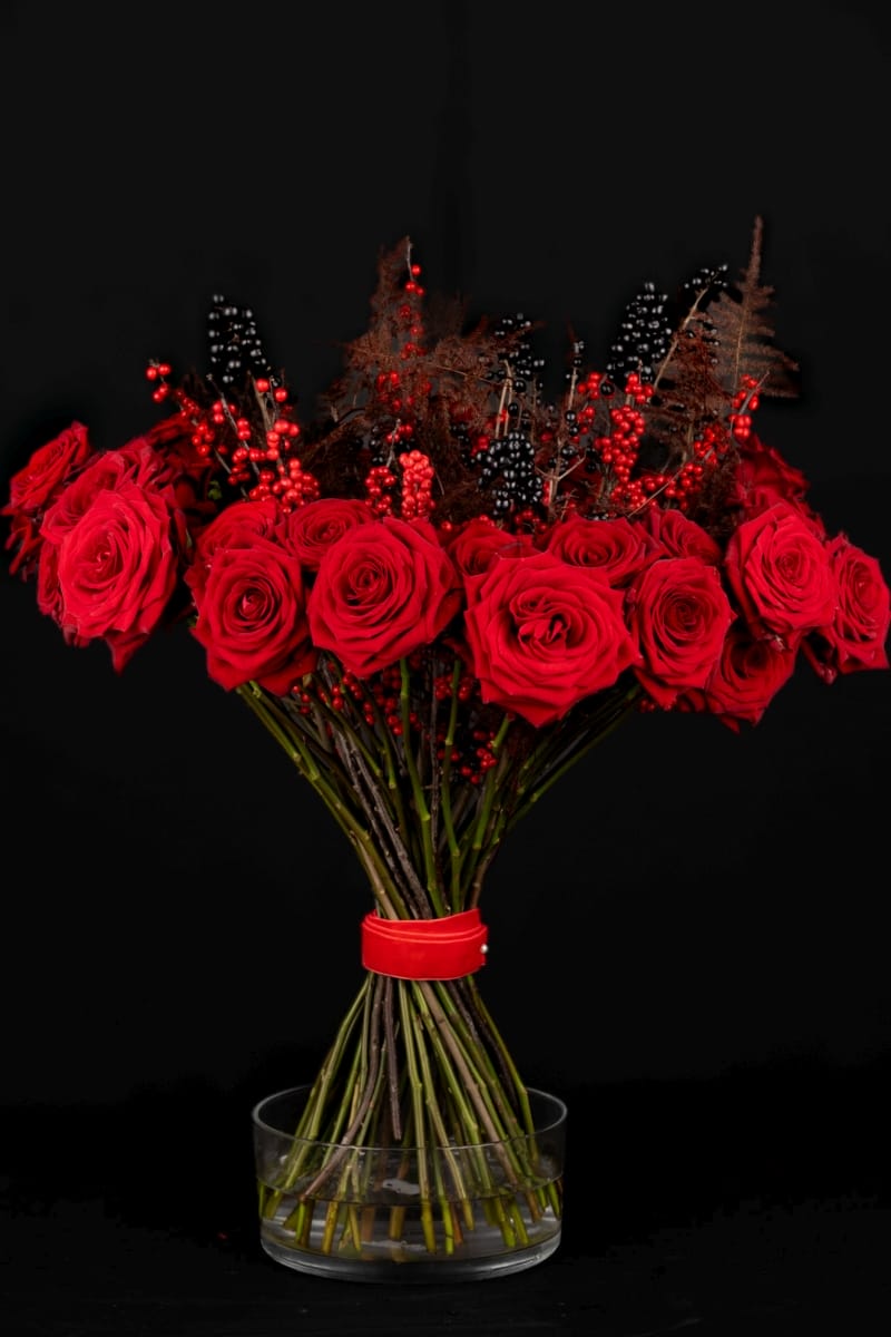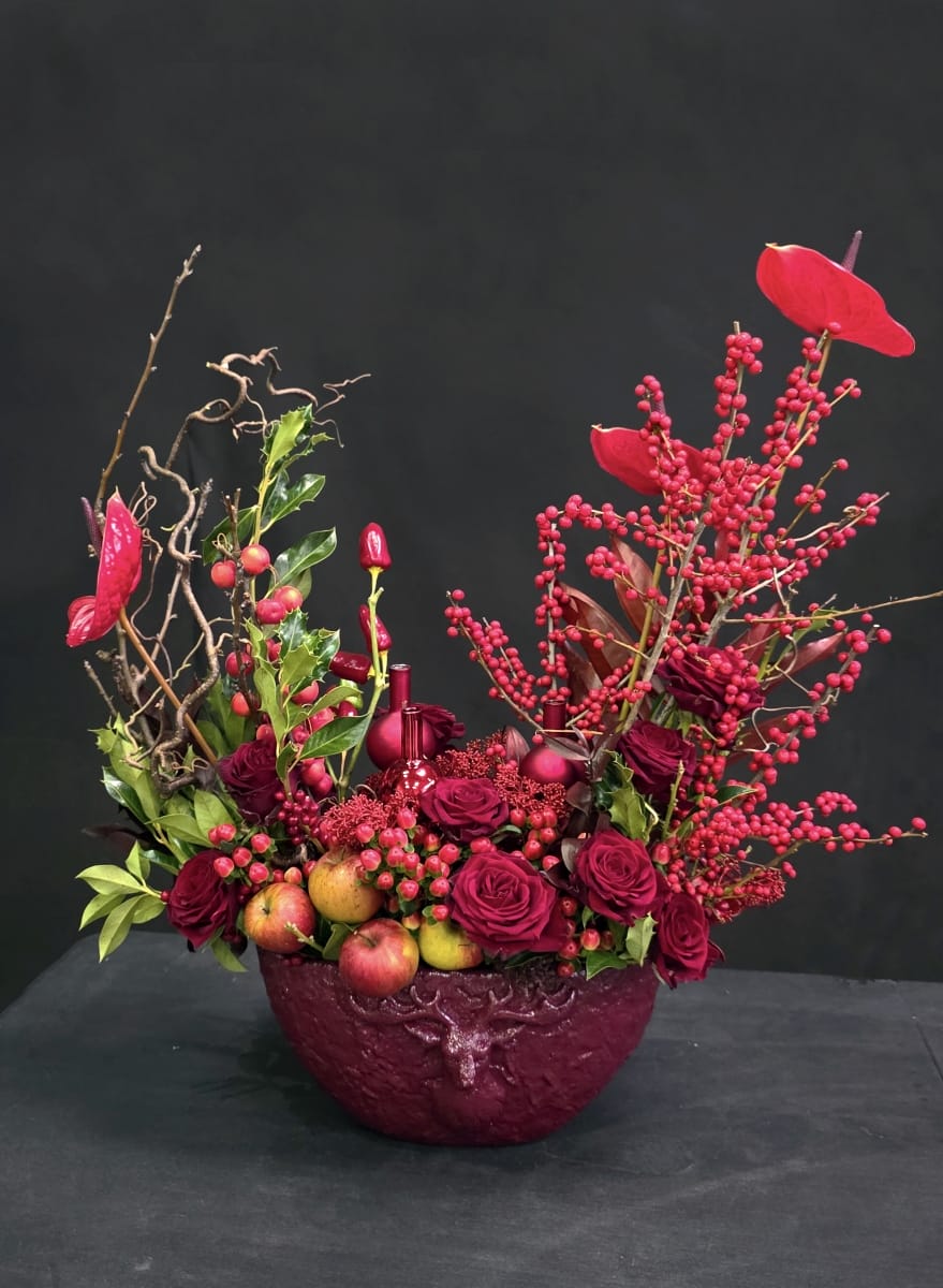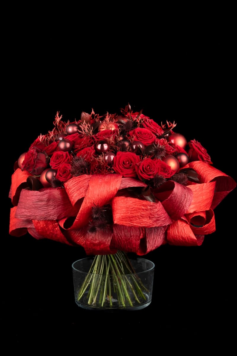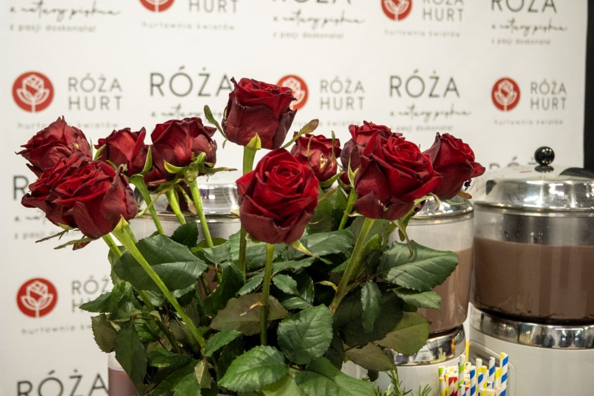 Nie mogło zabraknąć róż – w końcu to Hurtownia Kwiatów Róża była organizatorem pokazu. Przy okazji padła też mała ciekawostka: ulubioną odmianą Macieja Krzusa jest Red Naomi, co idealnie wpisało się w klimat czerwonych, klasycznych dekoracji.