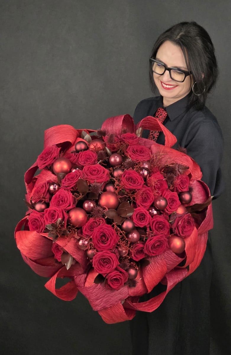 „Była to niesamowita przygoda — dla mnie pierwszy raz w takiej formule. Chciałam pokazać prace świąteczne, ale nie całkiem komercyjne. Stąd pomysł choćby na sanki czy bukiet z czerwoną papierową wstążką. To było bardzo rozwijające doświadczenie, grupa jest wspaniała. Każda z nas jest inna, ale w grupie panuje świetna atmosfera i ciągle się od siebie uczymy. To jest naprawdę cenne.”