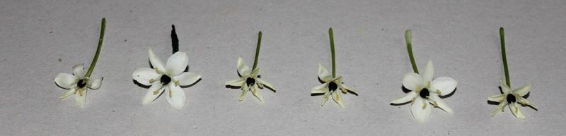 Jakość kwiatów śniedka Saundersa po 10. dniach przechowywania (od lewej: kwiat nie zabezpieczony czyli kontrola; kwiat zabezpieczony taśmą guttacol; kwiat potraktowany preparatem do przedłużania trwałości roślin w sprayu; kwiat potraktowany preparatem do przedłużania trwałości roślin w opryskiwaczu; kwiat zabezpieczony parafiną; kwiat zabezpieczony klej)