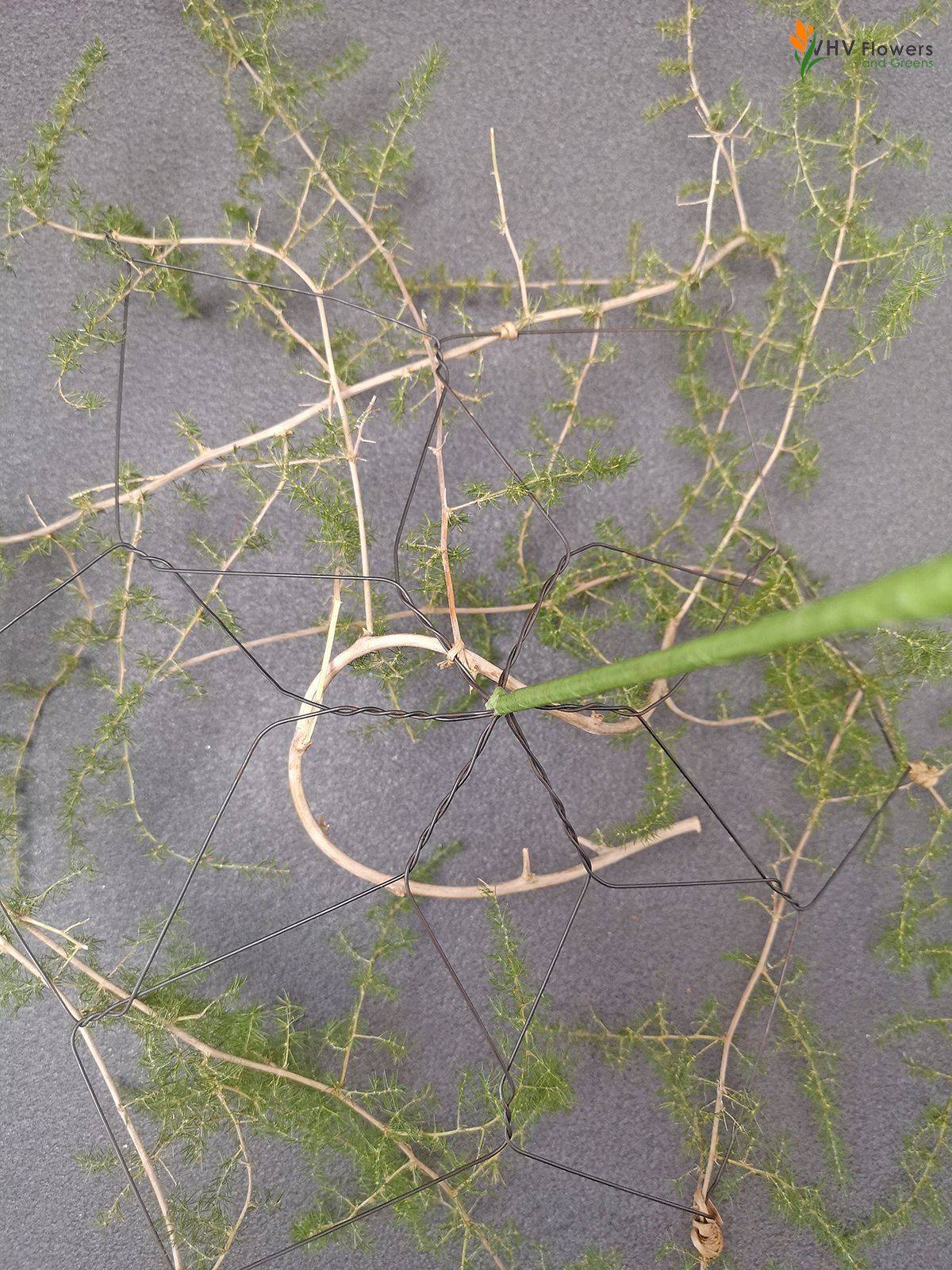 Tworzymy zieloną bazę z gałązek asparagusa, które dowiązujemy do konstrukcji za pomocą sznurkodrutu. Teraz możemy już zacząć układać kwiaty, które będziemy wsuwać przez oczka naszej konstrukcji od góry.